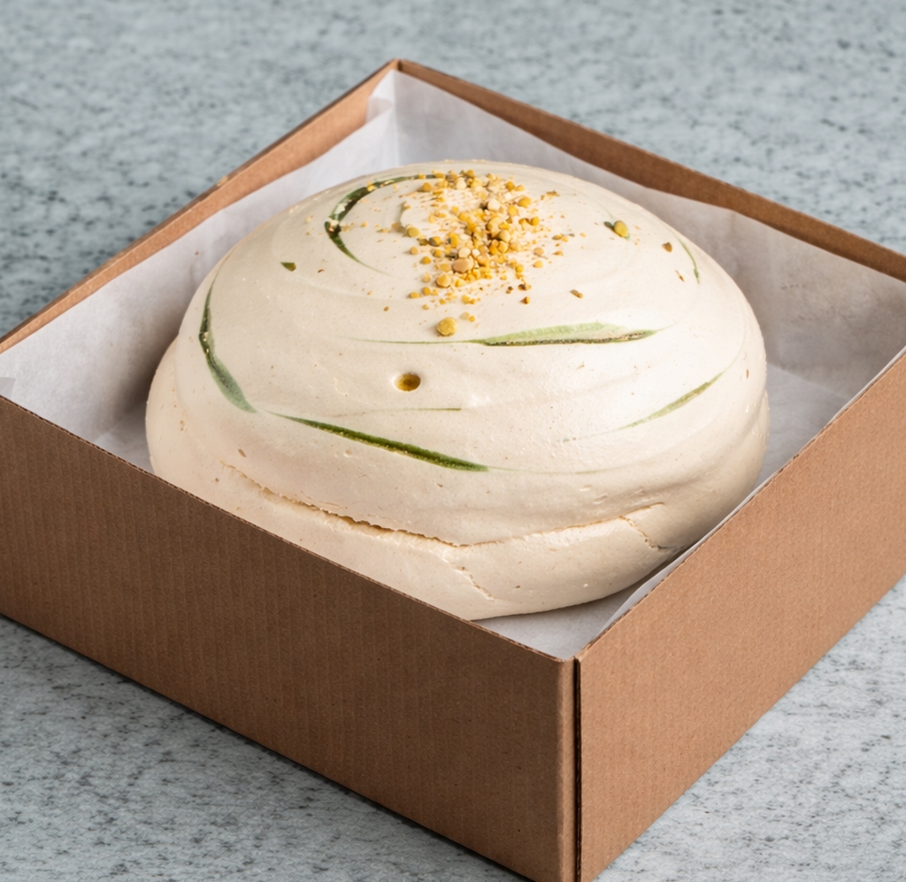 Целувка пистачо – фина, хрупкава целувка с изискан вкус на ароматно песто̀ пистачо. Белтъчната основа се топи нежно, разкривайки богатия ядков характер и леката сладост на истинското шамфъстък. Елегантен и лек десерт, който съчетава ефирност и луксозен вкус – идеален за кафе пауза, подарък или специален повод.