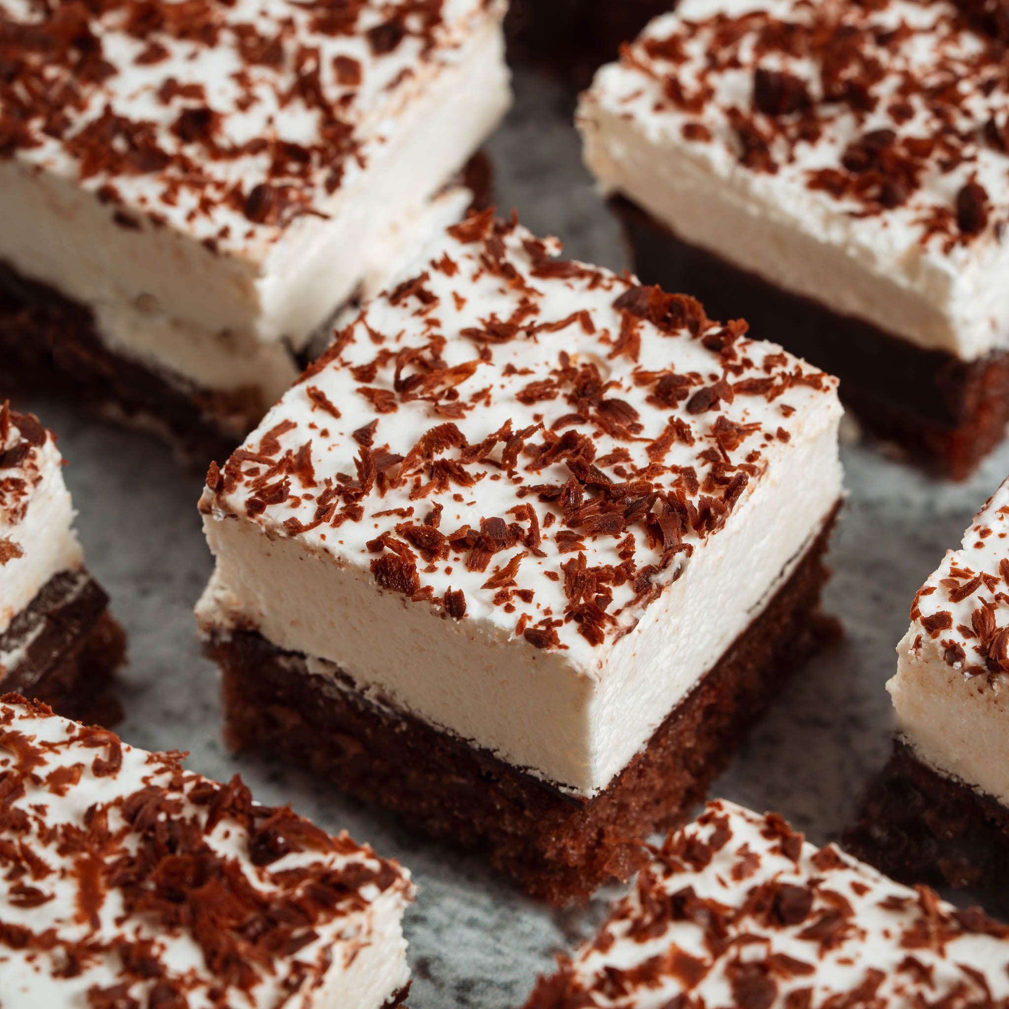 Елегантни десертни хапки от нашия авторски десерт Рондине. Какаов блат, напоен с портокалов сироп и покрит с трюфелов шоколад, служи за основа на лек крем от сметана, маскарпоне и жълтъци, завършен с ръчно настърган натурален шоколад.